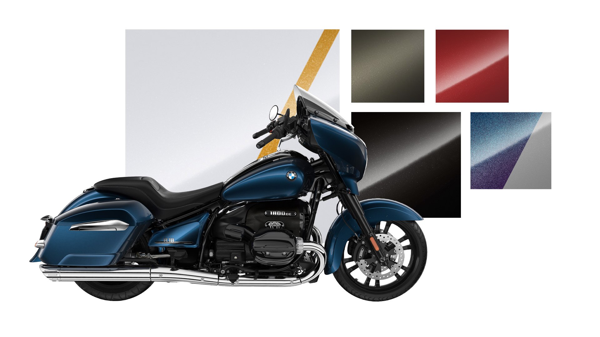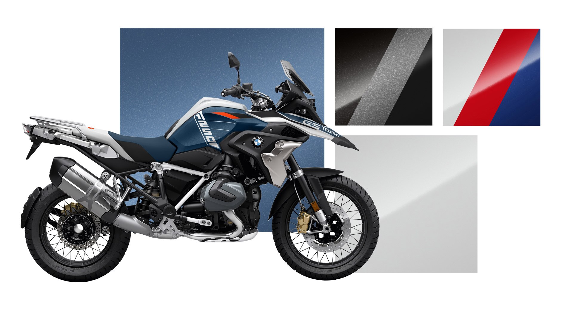 A Option 719 em mineral branco metalizado acentua as grandes superfícies da respetiva moto e sublinha a sua aparência elegante. As acentuações em dourado realçam com precisão os destaques das motos. Harmoniosa, equilibrada e atrativa: com a seu esquema de cores em azul "gravity" metalizado, a moto irradia verdadeira grandeza e supremacia.