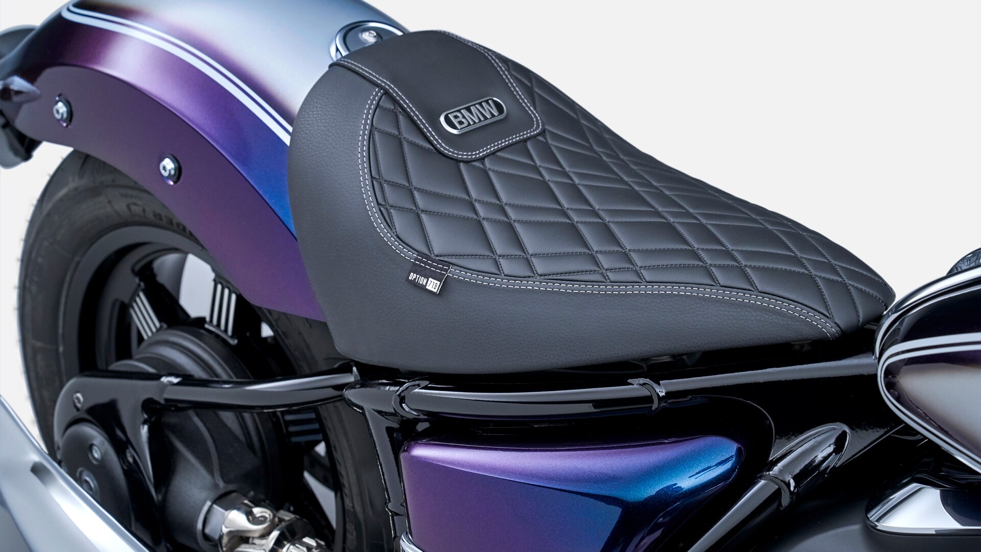 A nossa Option 719 oferece diversas possibilidades para conferires à R 18 a tua própria expressividade. A roda de fundição bicolor da Option 719 ICON completa o visual de alta qualidade da moto. E o assento da Option 719 em pele sintética preta com acolchoado e costuras em forma de losango, assim como a placa BMW cosida, tornam cada viagem ainda mais cómoda.