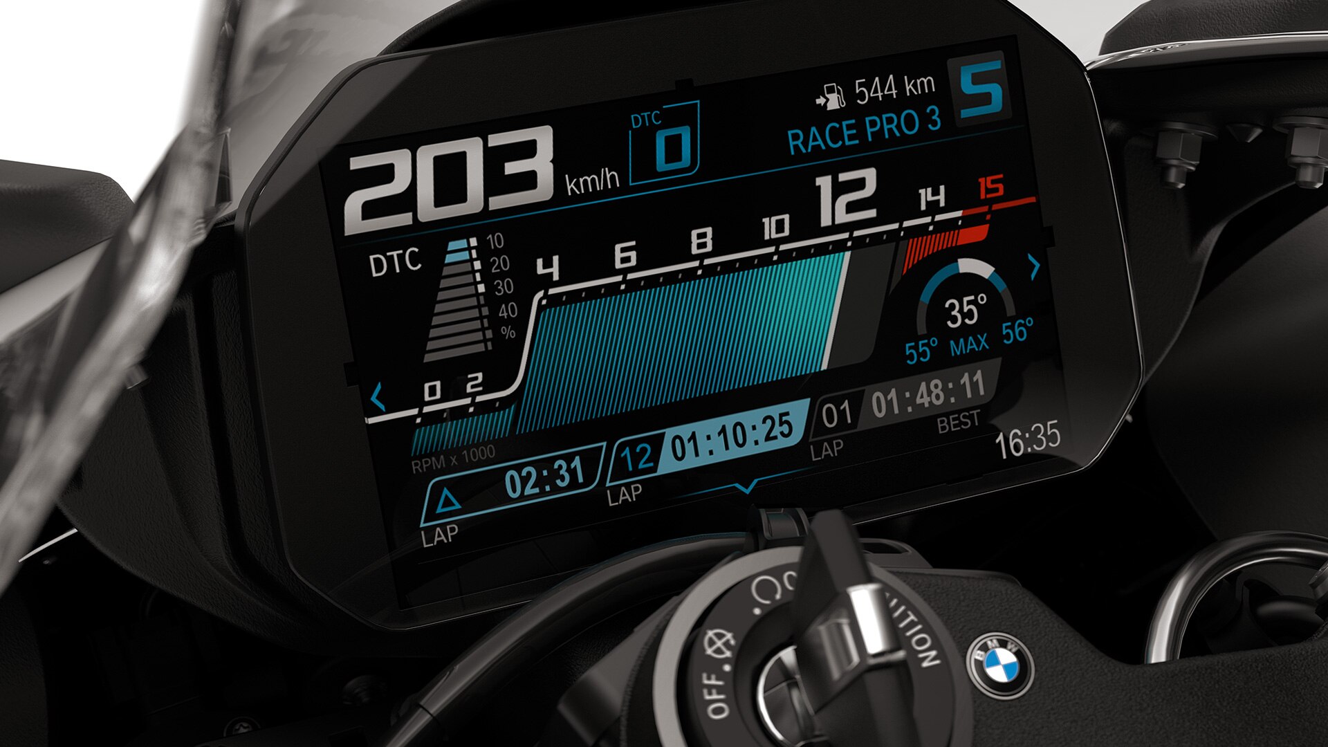 De volta às boxes após algumas voltas no circuito: depois de desligares e voltares a ligar a moto, será sempre apresentado o último ecrã utilizado. Assim, podes manter sempre a concentração e o foco no teu modo. Conforme a tua preferência, tens à disposição um ecrã Pure Ride e três ecrãs Core diferentes. Enquanto o motor está frio, o sistema adapta o regime máximo adequado. Agora, a luz de engrenagem indica claramente quando o conta-rotações está intermitente. Graças ao ecrã TFT com informações claras, podes consultar rapidamente todas as outras definições.